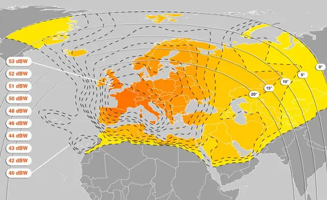 16 Satellite Transmission Band transponders (plus 4 in reserve), uplink: 7.3–18.1 GHz, downlink: 11.7–12.75 GHz, minimum power: 140 watts